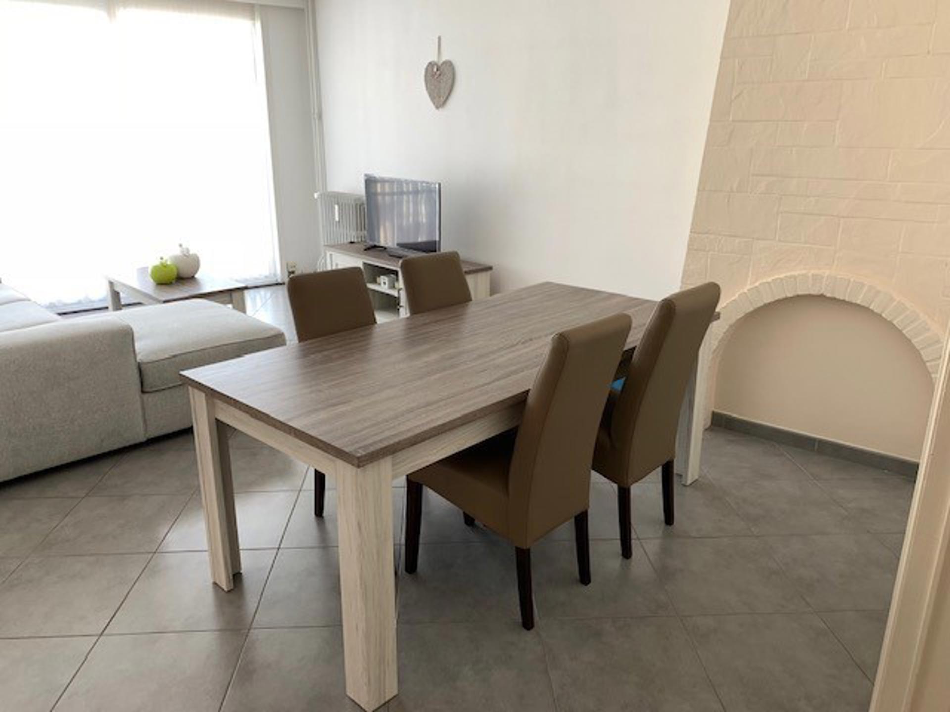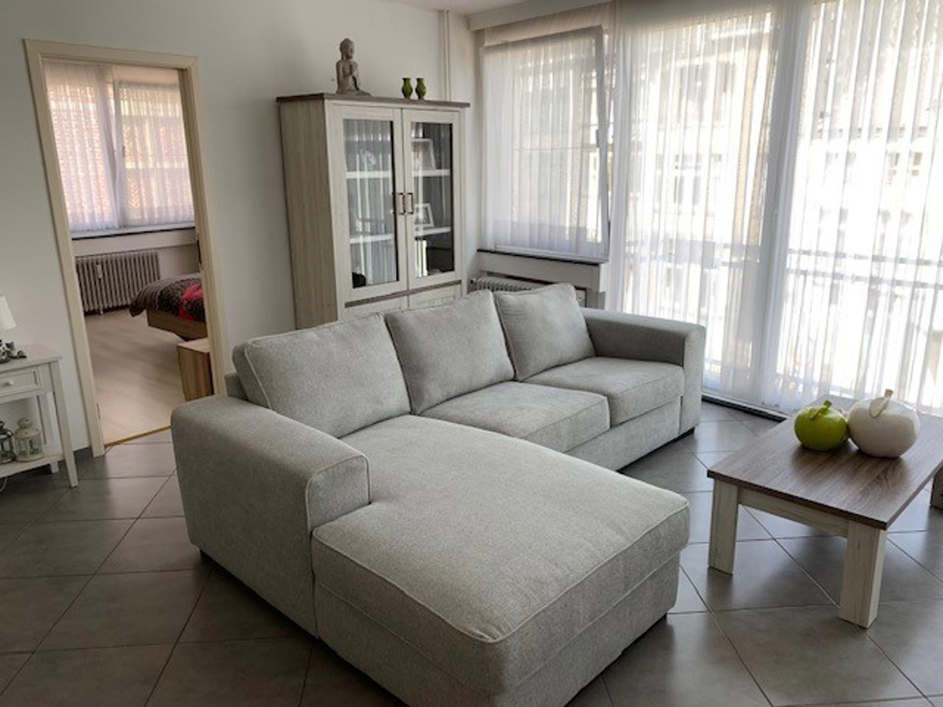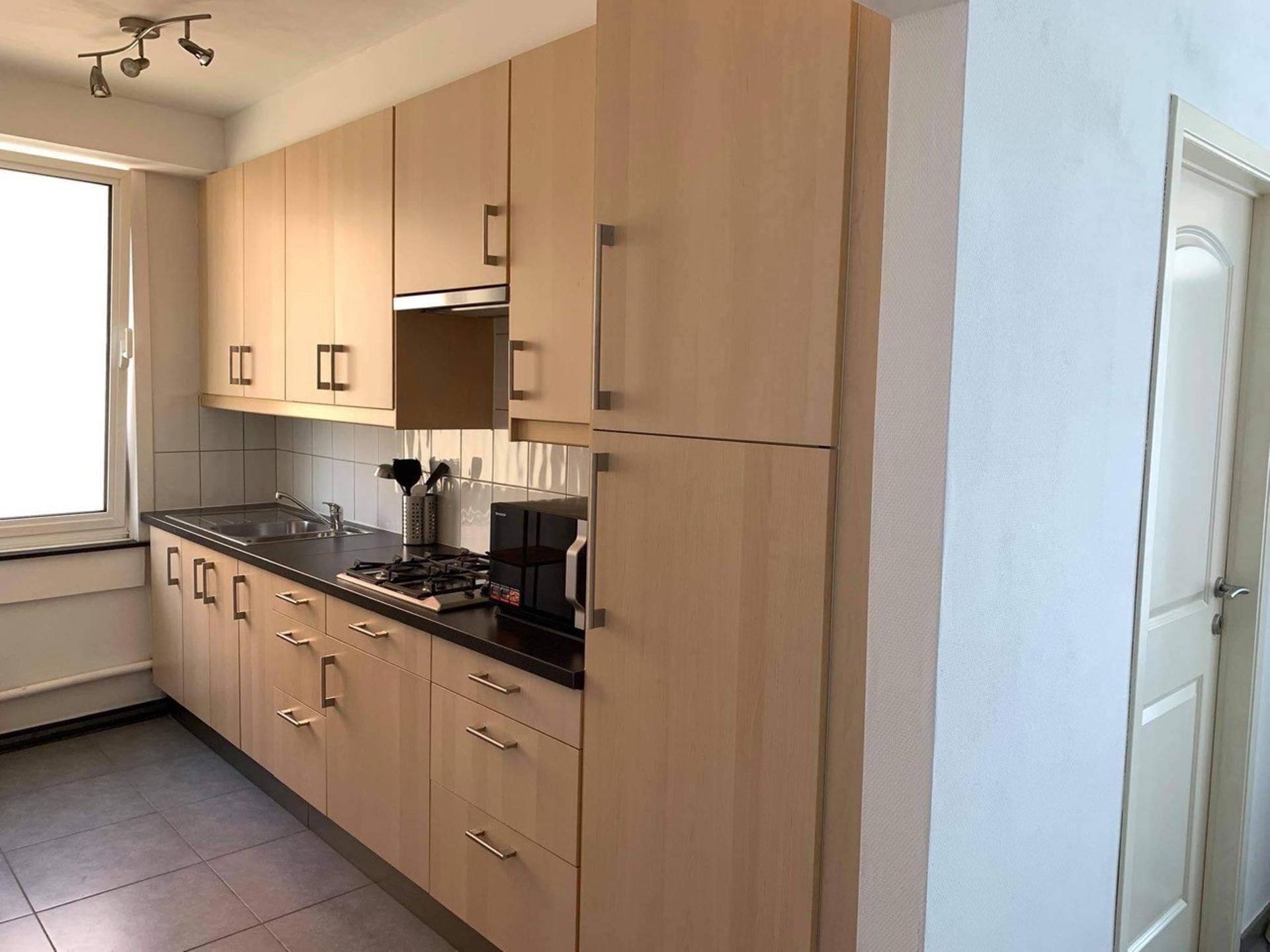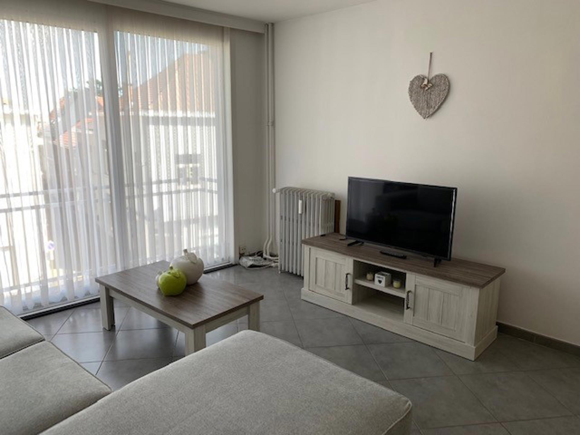 Appartement op het tweede verdiep, bestaande uit een inkomhal, woonkamer, keuken met eethoek, berging, toilet, badkamer, twee slaapkamers, kelder en balkon. In de provisie van 60 euro zit het onderhoud & verbruik van de gemeenschappelijke delen alsook het verbruik van de verwarming.